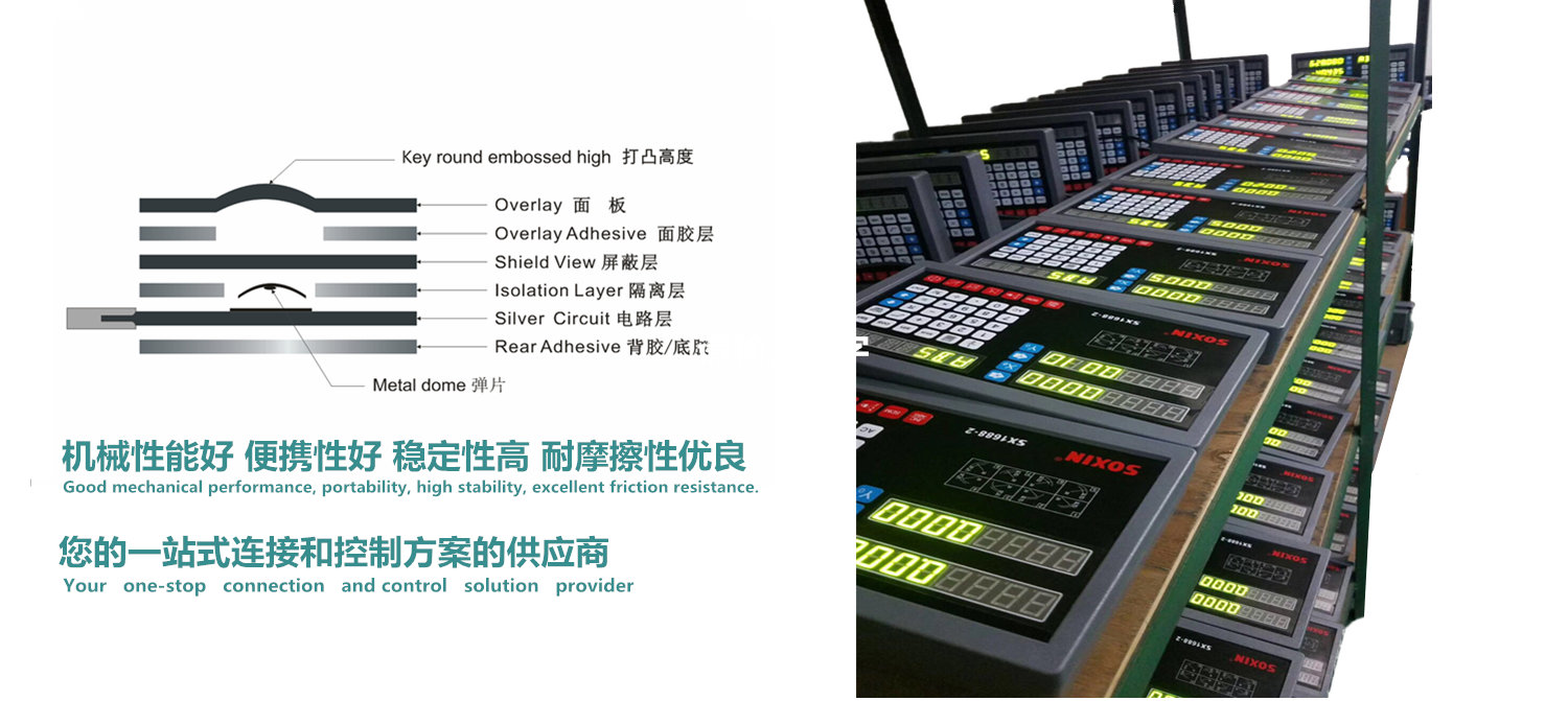 東莞東浦薄膜開關(guān)是集按鍵功能、指示元件、儀器面板為一體的一個(gè)人機(jī)界面。主要是由面板、上線電路、隔離層、下電路四部分組成。按下薄膜開關(guān),上電路的觸點(diǎn)向下變形,與下電路的極板接觸導(dǎo)通,手指松開后,上電路觸點(diǎn)反彈回來(lái),電路斷開,回路觸發(fā)一個(gè)信號(hào)。薄膜開關(guān)結(jié)構(gòu)嚴(yán)謹(jǐn),外形美觀,密封性好。具有防潮濕,使用壽命長(zhǎng)等特點(diǎn)。廣泛應(yīng)用于電子通訊、電子測(cè)量的儀器,工業(yè)控制,醫(yī)療設(shè)備,汽車工業(yè),智能玩具,家用電器等領(lǐng)域