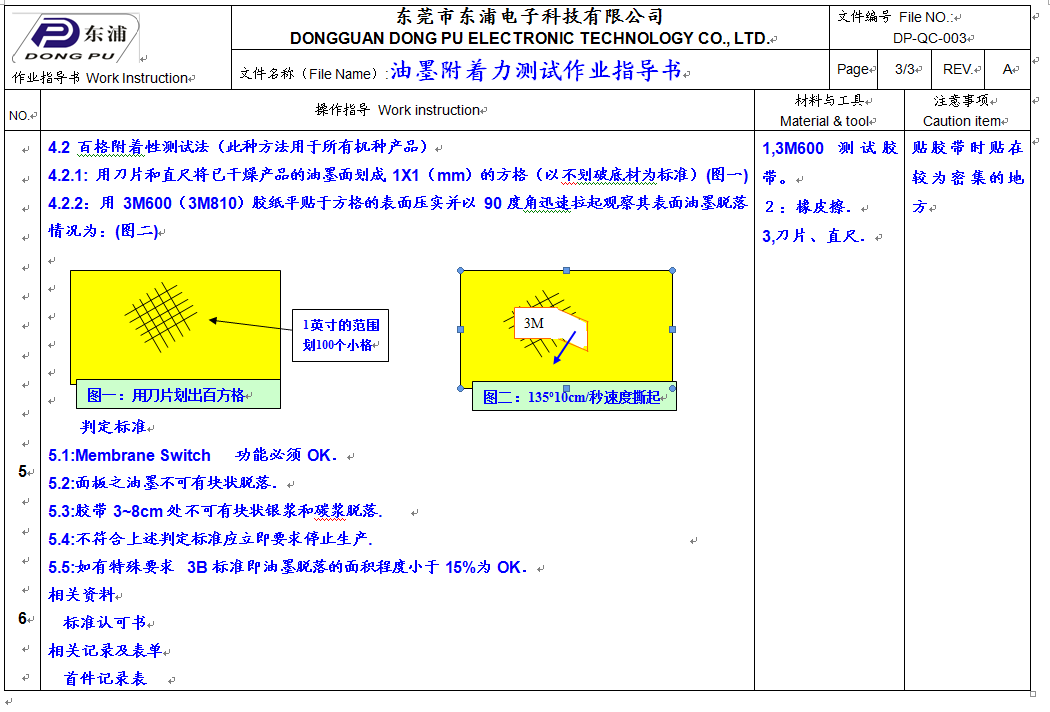 怎樣測試薄膜開關(guān)附著力及測試方式 download: 薄膜開關(guān)附著力測試作業(yè)指導(dǎo)書DP-QC-003.doc [ 返回列表 ] 上一篇:TPU薄膜按鍵及TPU的運(yùn)用 下一篇: 什么是薄膜開關(guān)
